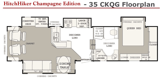 Step into high-end comfort with this Hitchhiker Champagne Edition 35’, one of the most respected fifth-wheel brands for quality and durability.