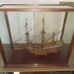 Captain Cooks famous ship the Golden Hinde which I built in 1997. Glass case is Size is 23 inches by 20 inches. Its time for some else to enjoy this historic Galeon. Back pane of glass is missing, easy fix. 2,000 pesos is a steal for this item.