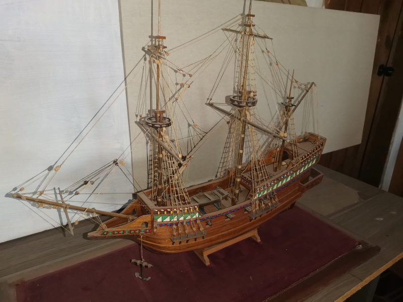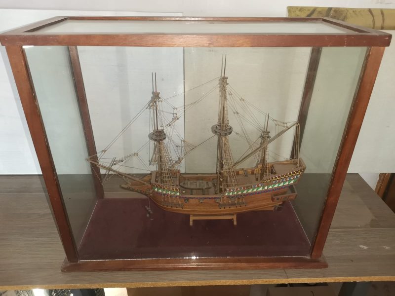 Captain Cooks famous ship the Golden Hinde which I built in 1997. Glass case is Size is 23 inches by 20 inches. Its time for some else to enjoy this historic Galeon. Back pane of glass is missing, easy fix. 2,000 pesos is a steal for this item.