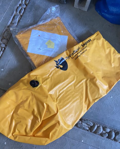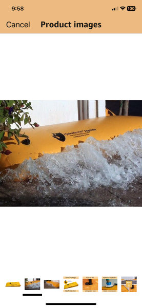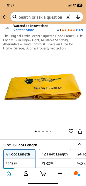 HydraBarrier blocks water from entering into the house. They are reusable and heavy duty. 6' long X 12" high. To use simply fill with water. Empty them when not in use. They fold flat when not in use and are easy to store. There are two; one was used once and the other is still in the bag. Purchased from Amazon for $110.00 USD each.