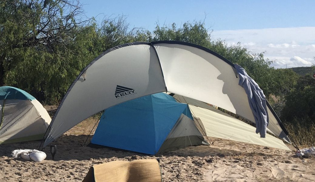 Shade tent for beach or yard. Self supporting without pegs or ropes. Made by Kelty. 10’x7’. Nylon over fibreglass poles. Comes with one optional wall. This unit is a three sided, three legged dome. You can stand up inside.