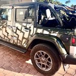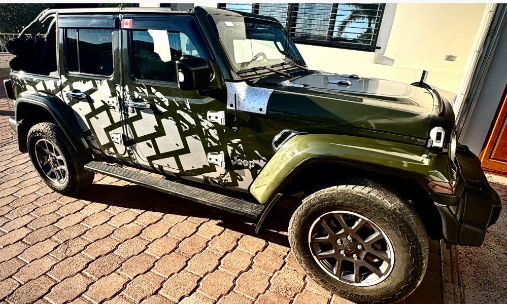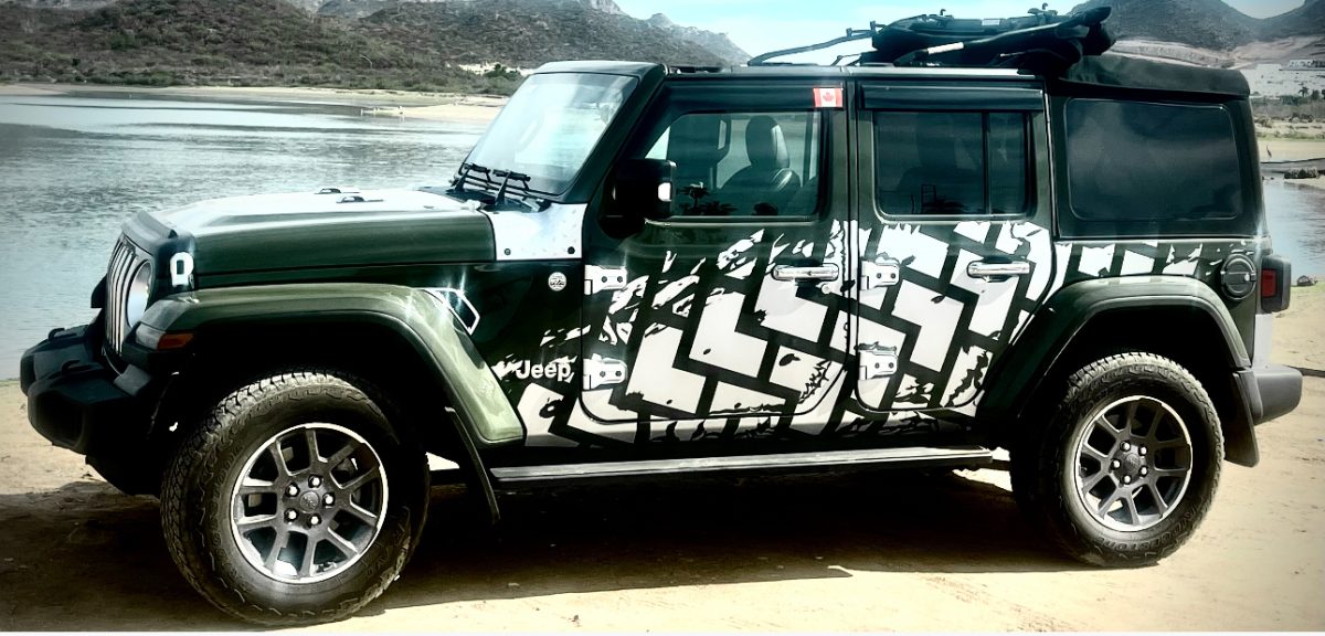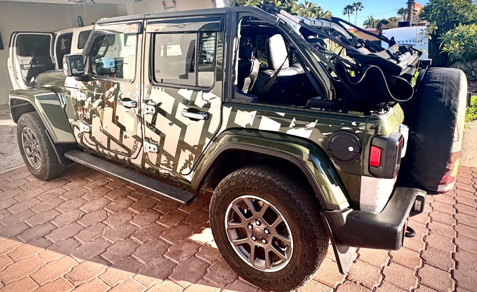 Loaded Sahara 4 door with all options Inc B/U cam, AC, leather, cruise, p/m, 4 way convertible roof, cold air return, custom graphics, all new fluids, 2 ltr turbo, good rubber, bikini tops, tinted lights, and more. Qualifies for Mx plates in 2026. Can be purchased in CAD, MxP, USD.