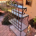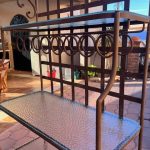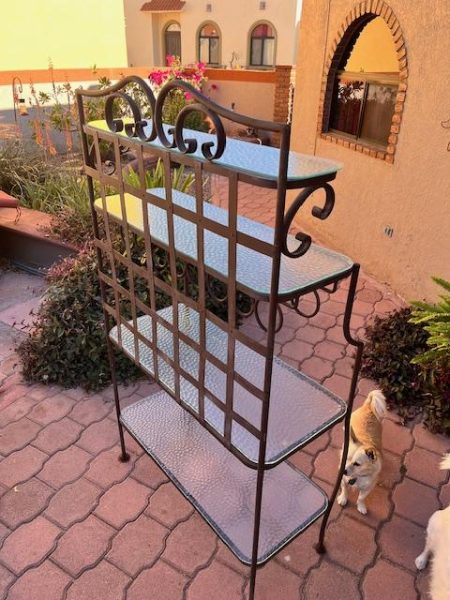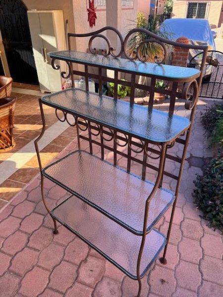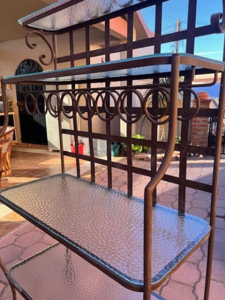 Beautiful welded steel shelving unit with dark brown powder coat. 101cm wide, 48cm deep, 84cm tall. Includes 4 textured glass shelves and 8 wine bottle holders. Solid construction in perfect condition, it just doesn’t fit our decor any longer. $2000 pesos.