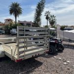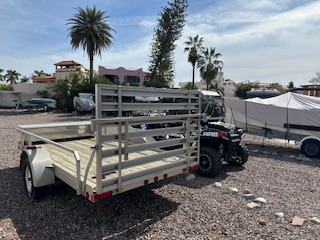 12 Foot Polaris Aluminum Trailer with mounted aluminum tool box in good shape. Wheel bearings are good and new tires on single axle mount. Spare tire is also new mounted on new rim.