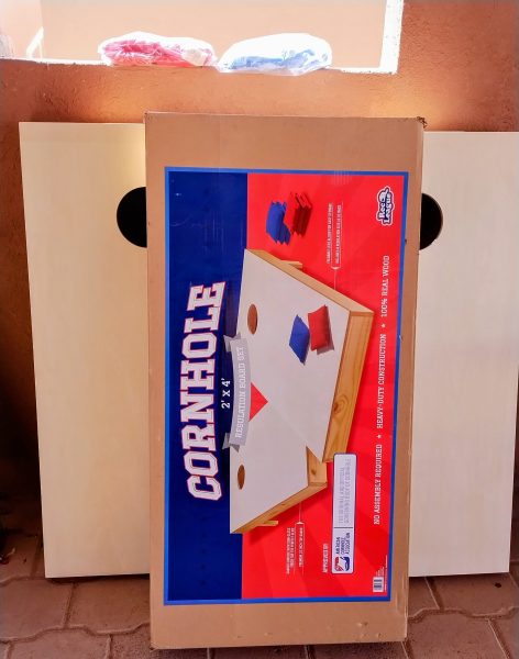 REC League Cornhole set, includes 2’ x 4’ boards (with foldable legs) and 8 bags.